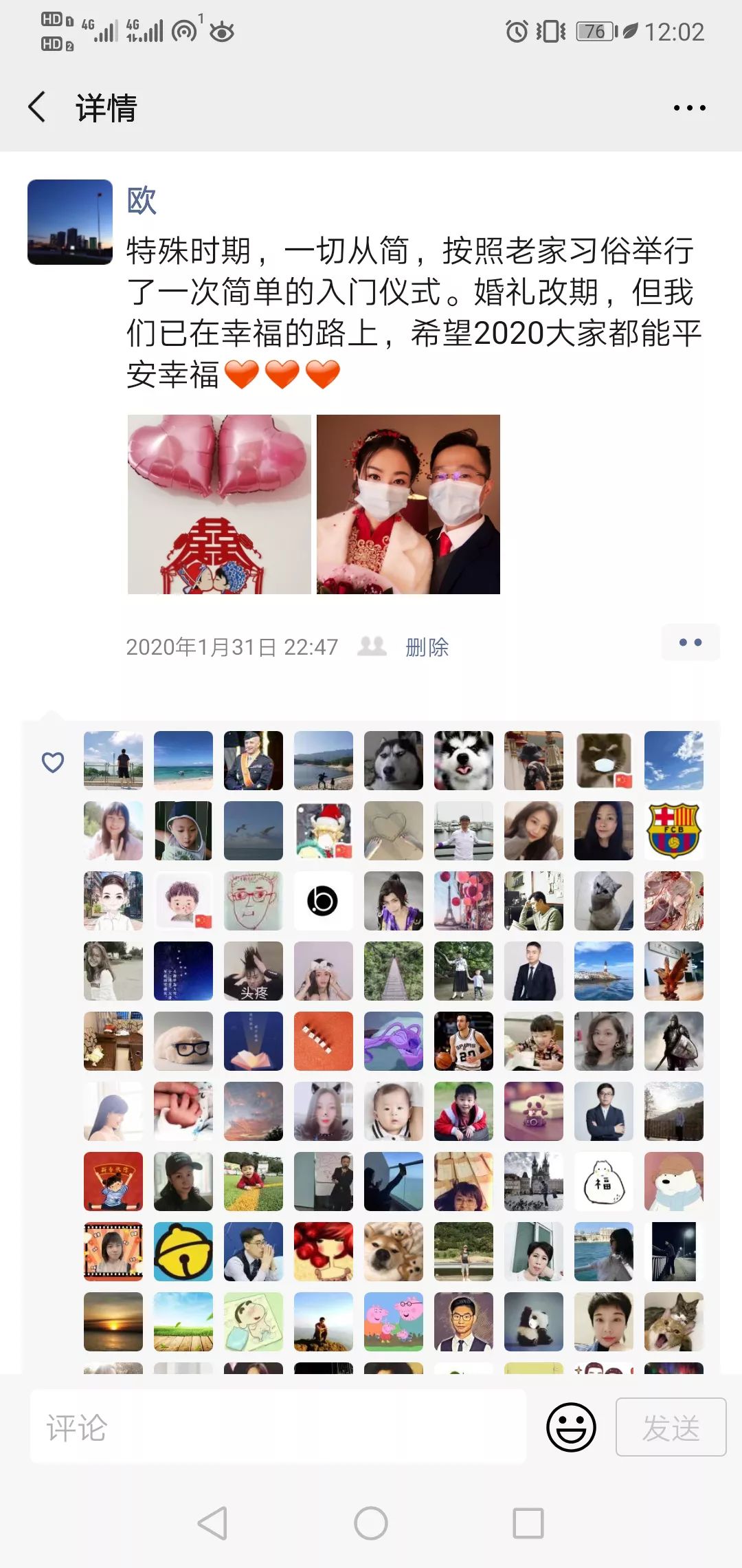 歐泉強(qiáng)的親朋好友紛紛點(diǎn)贊這場朋友圈“兩個(gè)人的婚禮”,并留言祝福?!叭∠麛[酒都是小事,做好防疫工作才是大事。作為黨員,聽黨號召是第一條,今年春節(jié)不聚,對他人好,對家人好,更是對自己的愛人好?!睔W泉強(qiáng)說。
