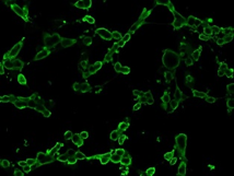 目前,呼吸疾病國家重點(diǎn)實(shí)驗(yàn)室聯(lián)合廣州海關(guān)技術(shù)中心已完成該病毒株的全基因組序列測(cè)定,并利用間接免疫熒光實(shí)驗(yàn)結(jié)果顯示患者血漿可識(shí)別該分離株感染細(xì)胞(圖1),病毒粒子可在電鏡下觀察到,具有冠狀病毒典型結(jié)構(gòu)(圖2)。