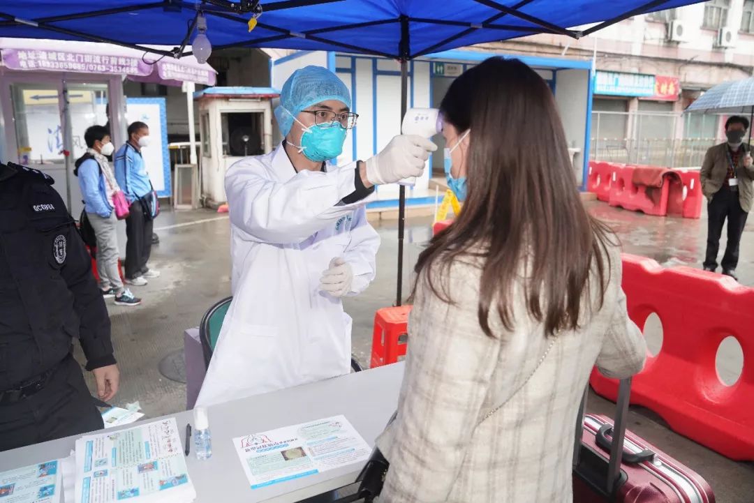 ▲1月25日,新城汽車客運站,醫(yī)護人員給出站旅客測量體溫。(資料圖)