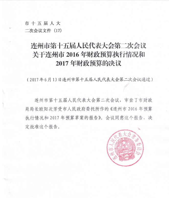 關(guān)于連州市2016年財政預(yù)算執(zhí)行情況和2017年財政預(yù)算的決議