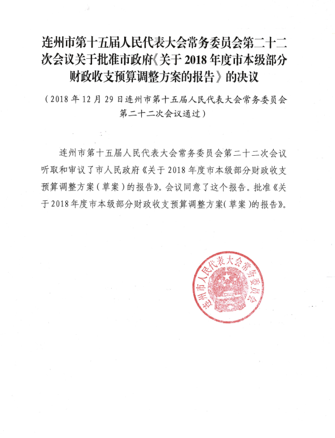 連州市第十五屆人民代表大會常務(wù)委員會第二十二次會議關(guān)于批準(zhǔn)市政府《關(guān)于2018年度市本級部分財政收支預(yù)算調(diào)整方案的報告》的決議