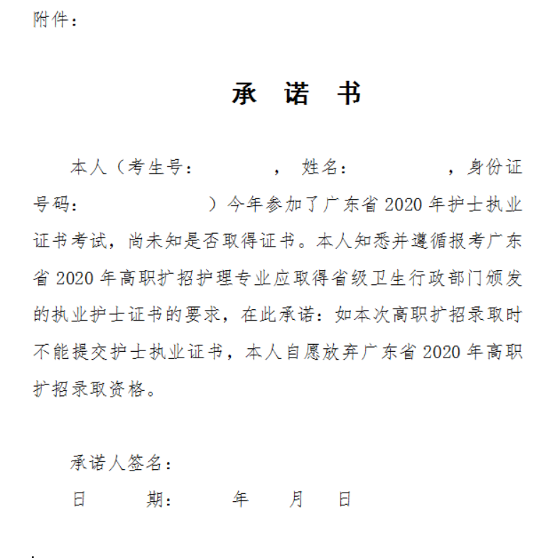 今年我省執(zhí)業(yè)護士證書考試受疫情影響推遲,現(xiàn)由于主辦單位尚未發(fā)放今年考試合格的考生證書,經(jīng)研究,決定先準予今年已參加我省執(zhí)業(yè)護士證書考試且符合高職擴招報名其他條件的考生憑執(zhí)業(yè)護士證書考試準考證和承諾書(內(nèi)容見附件)報考高職擴招專項行動護理專業(yè)。錄取時,未取得執(zhí)業(yè)護士證書的考生不予錄取。