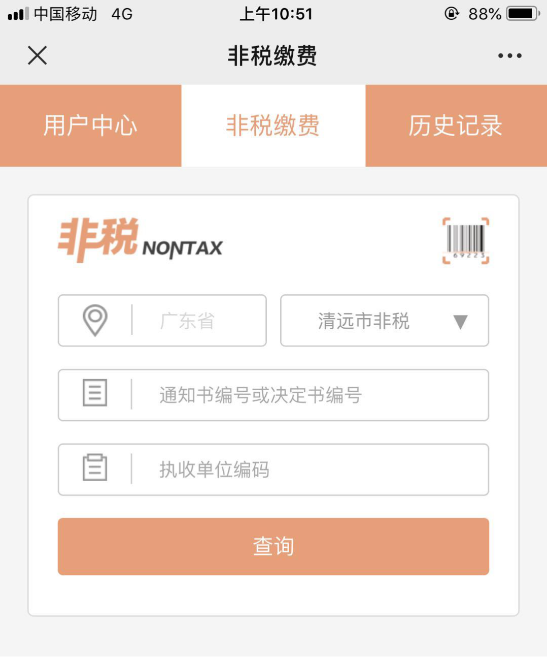2、進入繳費查詢頁面后,選擇廣東省清遠市非稅,對應輸入繳費單的通知書編號、執(zhí)收單位編碼,點擊“查詢”。