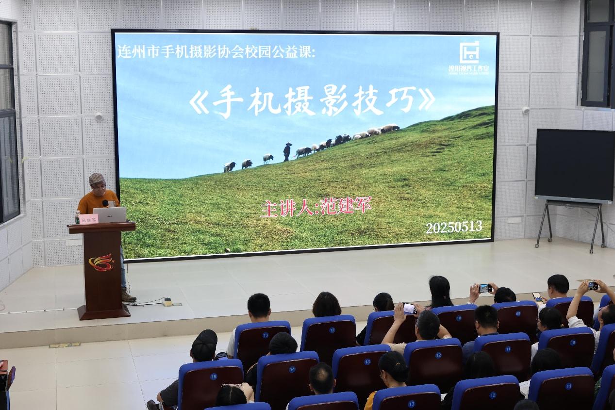 揭牌儀式后,湟川視界工作室負責人范建軍帶來首場特色課程講座——《手機攝影技巧》。通過案例演示與互動問答,現(xiàn)場師生掌握了構圖、光影等實用技能,反響熱烈。