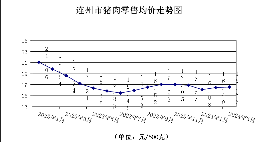 3月份,我市豬肉零售價格升幅收窄,豬肉價格微升。農(nóng)貿(mào)市場監(jiān)測的四種主要豬肉零售均價16.56/500克,環(huán)比升0.42%。其中,排骨20.24/500克,環(huán)比降1.41%;精瘦肉17.00/500克,環(huán)比升1.13%;肋條肉14.50/500克,環(huán)比升1.33%,有皮上肉14.50/500克,環(huán)比升1.33%