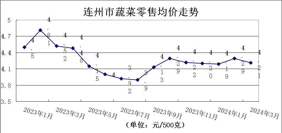 3月份,我市蔬菜零售價格小幅下降。農(nóng)貿(mào)市場監(jiān)測的30種主要蔬菜零售價格“7716,蔬菜類平均零售價格為4.21/500克,環(huán)比降1.86%。其中,葉菜類零售價格為4.05/500克,環(huán)比3.80%,花菜類零售價格為3.68/500克,環(huán)比升1.66%,瓜菜類零售價格為4.44/500克,環(huán)比降0.22%,根莖類零售價格為4.41/500克,環(huán)比1.34%。
