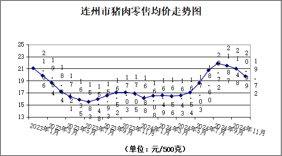 12月份,我市豬肉零售價(jià)格持續(xù)下降。農(nóng)貿(mào)市場監(jiān)測的四種主要豬肉零售均價(jià)為19.72元/500克,環(huán)比降6.05%。其中,排骨26.24元/500克,環(huán)比降10.26%;精瘦肉21.21元/500克,環(huán)比降3.50%;肋條肉15.71元/500克,環(huán)比降4.09%,有皮上肉15.71元/500克,環(huán)比降4.09%。