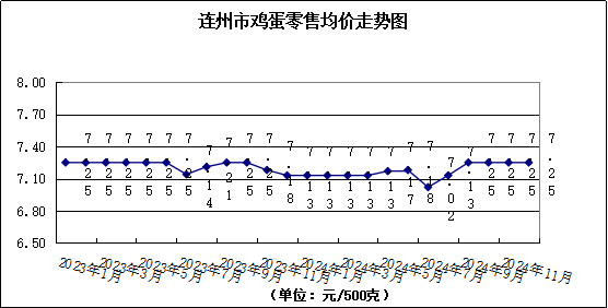 蛋類雞蛋平均零售價(jià)格為7.25元/500克,環(huán)比不變。鴨蛋平均零售價(jià)格為8.63元/500克,環(huán)比不變。