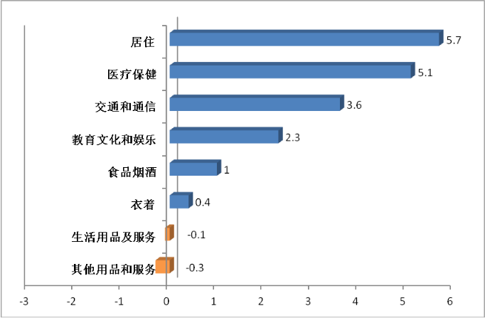 (二)按構(gòu)成屬性看:上半年,八大類商品及服務(wù)價(jià)格同比指數(shù)呈“六漲二降”態(tài)勢(shì),居住類漲幅最大。其中,居住類漲幅最大(上漲5.7%),其他價(jià)格上漲的類別和服務(wù)是:醫(yī)療保健類(上漲5.1%)、交通和通信類(上漲3.6%)、教育文化和娛樂(lè)類(上漲2.3%)、食品煙酒類(上漲1.0%)、衣著類(上漲0.4%),價(jià)格下跌的類別是:生活用品及服務(wù)類(下跌0.2%)、其他用品和服務(wù)類(下跌0.3%)。上半年,居住類價(jià)格拉動(dòng)CPI上漲1.1個(gè)百分點(diǎn),成為推動(dòng)CPI 上漲的主要因素。(見(jiàn)圖2)。