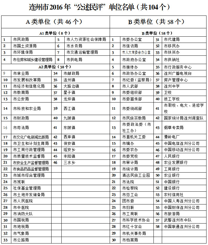 將市直正科以上單位、鎮(zhèn)(鄉(xiāng))以及與社會(huì)公眾聯(lián)系密切的省、清駐連單位共104個(gè)單位(名單見(jiàn)附件1)列入“公述民評(píng)”活動(dòng)范圍。按照突出重點(diǎn)、重心下移的工作思路,將市民政局、市國(guó)土局、市環(huán)保局、市住建局、市水務(wù)局、市供電局、市人社局、市交通局等8個(gè)單位列為重點(diǎn)評(píng)議單位(A1類),繼續(xù)開(kāi)展抽檢評(píng)議,并對(duì)重點(diǎn)評(píng)議單位具有行政執(zhí)法或監(jiān)督職能的部分業(yè)務(wù)科室人員進(jìn)行評(píng)議,著力解決不作為、慢作為和亂作為的問(wèn)題。