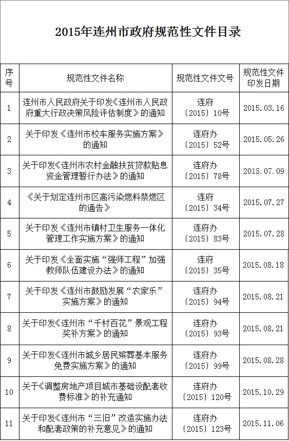 連州市人民政府辦公室關(guān)于公布2015年連州市政府規(guī)范性文件目錄的公告