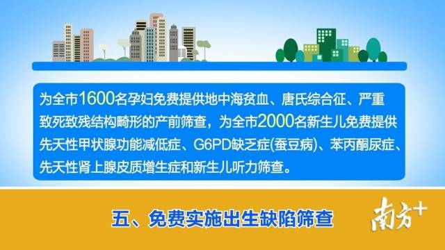 五、免費實施出生缺陷篩查。為全市1600名孕婦免費提供地中海貧血、唐氏綜合征、嚴重致死致殘結構畸形的產前篩查,為全市2000名新生兒免費提供先天性甲狀腺功能減低癥、G6PD缺乏癥(蠶豆病)、苯丙酮尿癥、先天性腎上腺皮質增生癥和新生兒聽力篩查。(主管部門:市衛(wèi)生健康局)