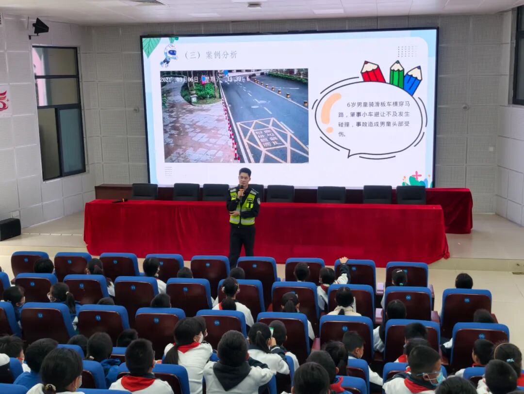 在廣州六中連州實驗學校附屬小學,民警結合學生出行特點,講解安全知識。通過實地體驗公交車盲區(qū)、指導正確系安全帶等方式,幫助學生“知危險、會避險”。