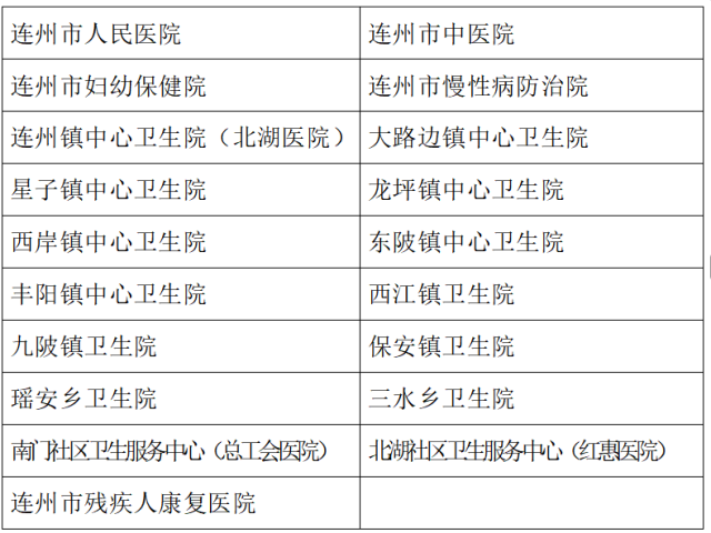 答:2026年1月1日開始,連州全市所有公立醫(yī)療機構開展相應服務(具體名單見下表)。