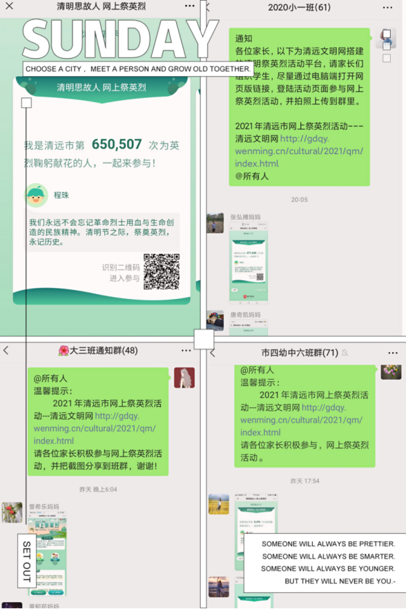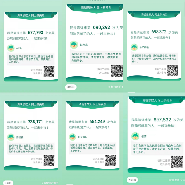 組織廣大教師,家長(zhǎng)和幼兒大手牽小手登錄中國(guó)文明網(wǎng)、央視網(wǎng)、“文明清遠(yuǎn)”公眾號(hào)等平臺(tái),通過(guò)在網(wǎng)上向先賢先烈鞠躬獻(xiàn)花、抒寫(xiě)感言寄語(yǔ)的方式,表達(dá)對(duì)先烈先賢的感恩和敬仰,繼承和發(fā)揚(yáng)革命精神。